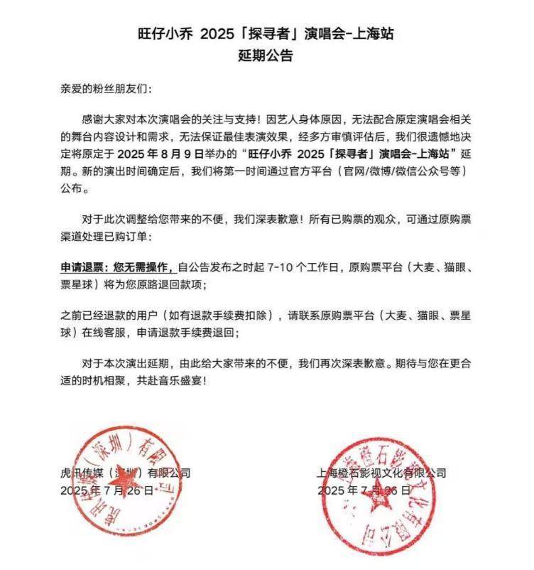 7月26日,旺仔小乔演唱会把握方发布宽限公告称,因艺东谈主躯壳原因,无法协作原定演唱会有关的舞台实质规划和需求,无法保证最好饰演成果,经多方审慎评估后,旺仔小乔2025“探寻者”演唱会-上海站宽限。
