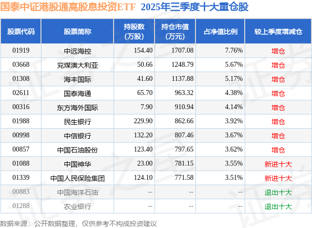 从基金范围来看,国泰中证港股通高股息投资ETF基金2025年三季度公布的基金范围为2.2亿元,较上一期范围9904.85万元变化了1.21亿元,环比变化了122.21%。该基金最新一期财富建设为:股票占净值比98.55%,无债券类财富,现款占净值比0.49%。从基金抓仓来看,该基金当季前十大股票仓位达45.39%,第一大重仓股为中远海控(01919),抓仓占比为7.76%。