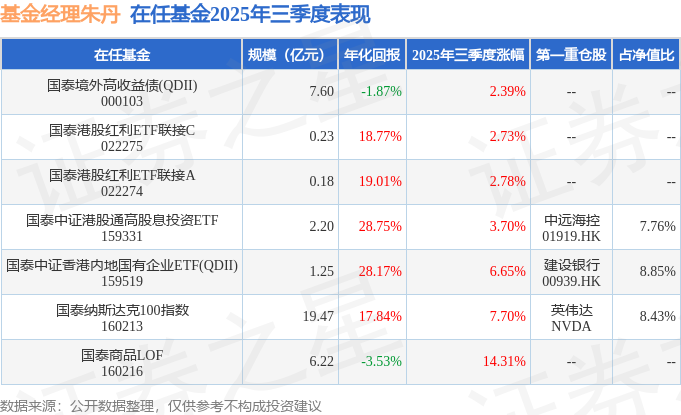 国泰中证港股通高股息投资ETF现任基金司理为朱丹 麻绎文。其中在职基金司理朱丹已从业4年又358天,2024年7月23日负责接办处理国泰中证港股通高股息投资ETF,任职时分累计薪金为37.69%。现在还处理着7只基金产物(包括A类和C类),其中本季度阐扬最好的基金为国泰商品LOF(160216),季度净值涨幅为14.31%。