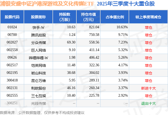 从基金界限来看,浦银安盛中证沪港深游戏及文化传媒ETF基金2025年三季度公布的基金界限为0.77亿元,较上一期界限3705.36万元变化了4021.17万元,环比变化了108.52%。该基金最新一期钞票成立为:股票占净值比98.93%,无债券类钞票,现款占净值比2.53%。从基金握仓来看,该基金当季前十大股票仓位达56.28%,第一大重仓股为快手-W(01024),握仓占比为10.63%。